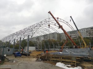 Начатое в августе 2017 г. строительство ведется полным ходом. К комплексу уже подведены все инженерные коммуникации: вода, канализация, газ, электричество. Выполнен монтаж внешних ограждающих конструкций административного блока, где будут размещены раздевалки и душевые спортсменов.